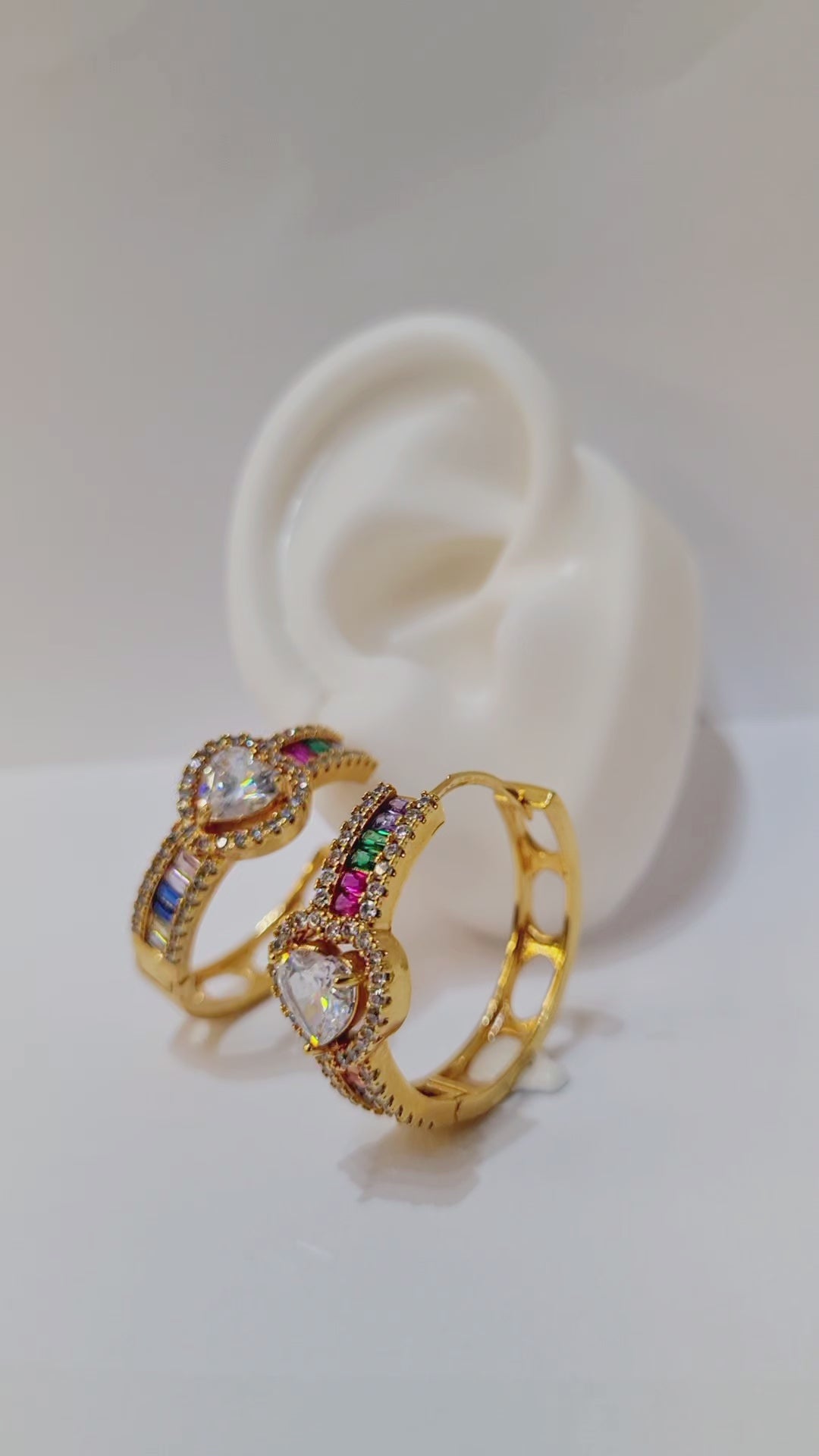 Com design moderno e elegante, esse brinco apresenta um coração central cravejado em zircônia, rodeado por pedras coloridas em estilo rainbow. Uma peça cheia de vida e sofisticação, perfeita para destacar qualquer look.