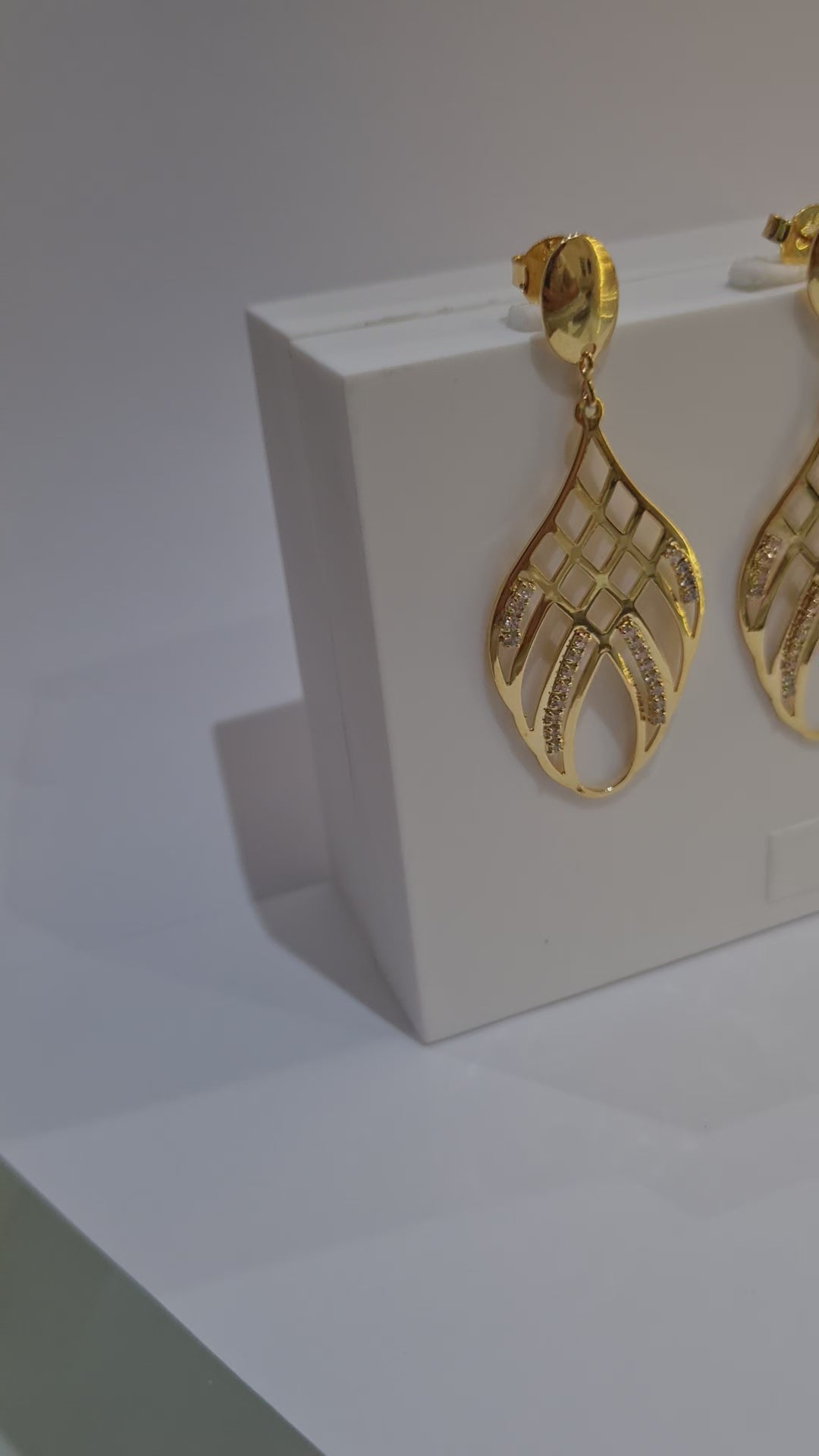 Este brinco apresenta um design em formato de gota vazada, com detalhes geométricos e fileiras de zircônias cravejadas que proporcionam brilho delicado e refinado. A base arredondada confere um toque de leveza e balanço à peça.