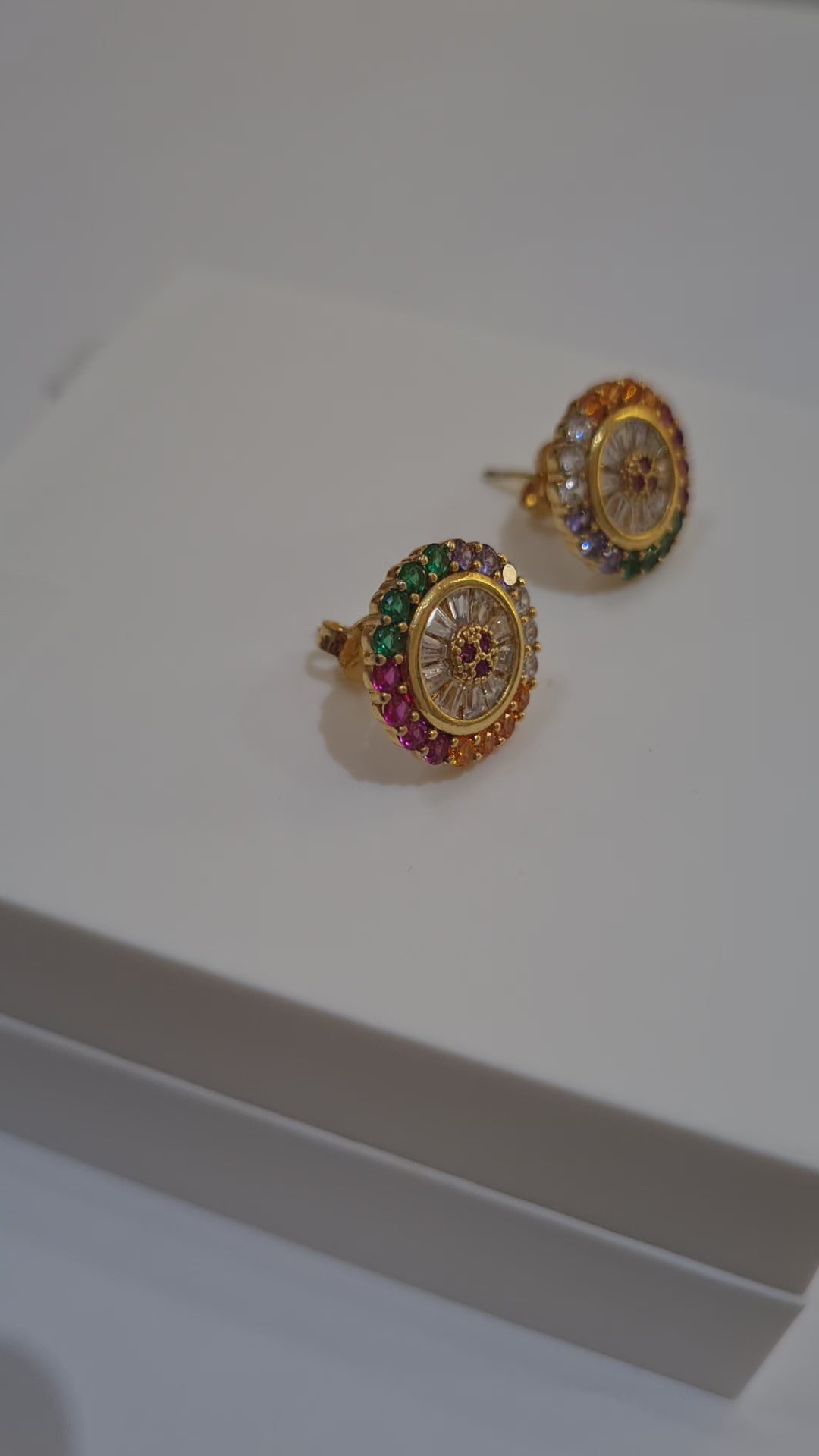 Este brinco redondo é uma verdadeira joia fashion: possui cravação delicada de zircônias coloridas ao redor e zircônias brancas lapidadas ao centro, criando um efeito de brilho intenso e sofisticado. A combinação de cores vibrantes traz leveza e modernidade à peça.