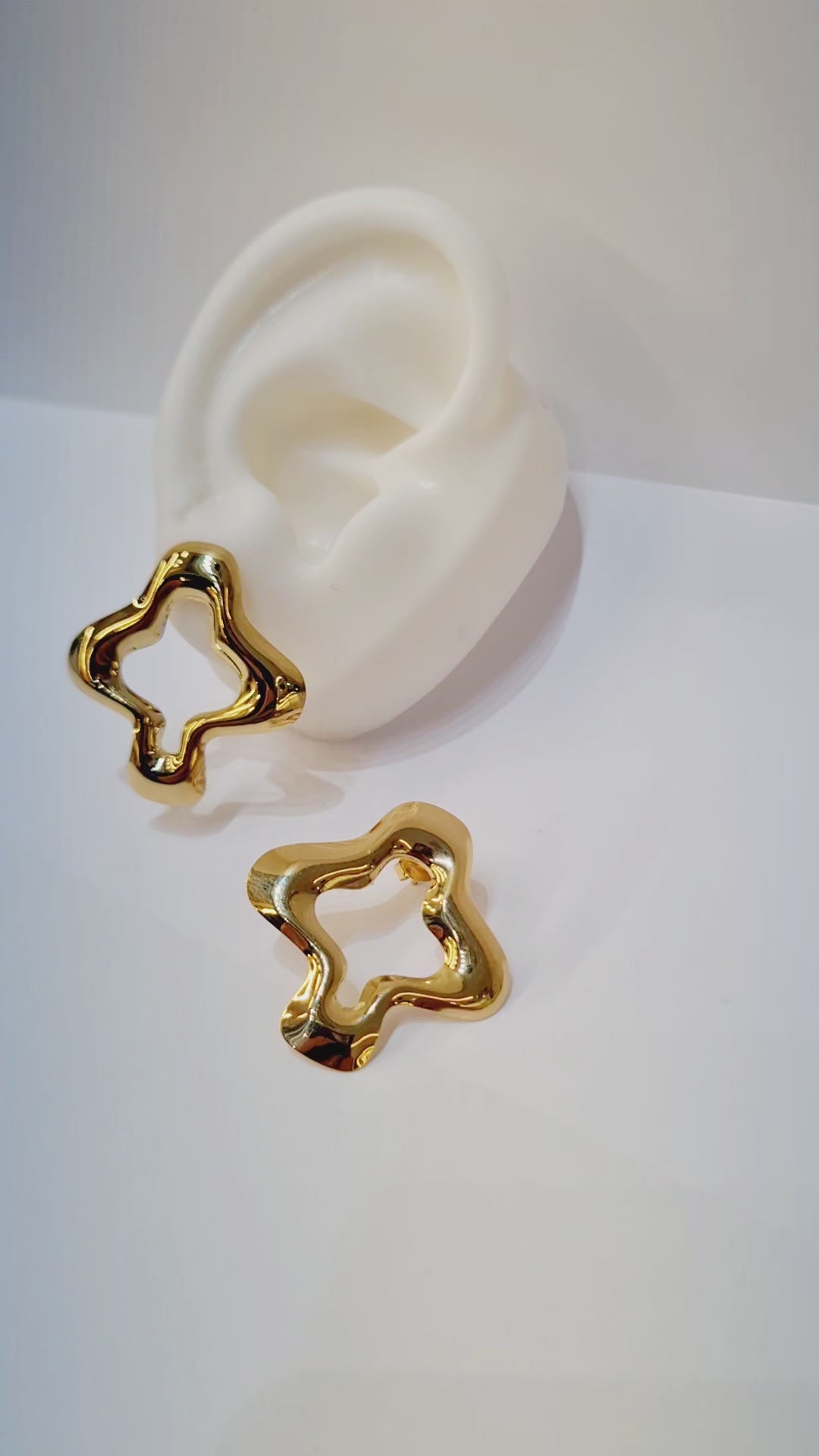 Com design em formato de trevo vazado e acabamento espelhado, esse brinco é perfeito para compor looks elegantes e estilosos — ideal para quem ama acessórios com personalidade.