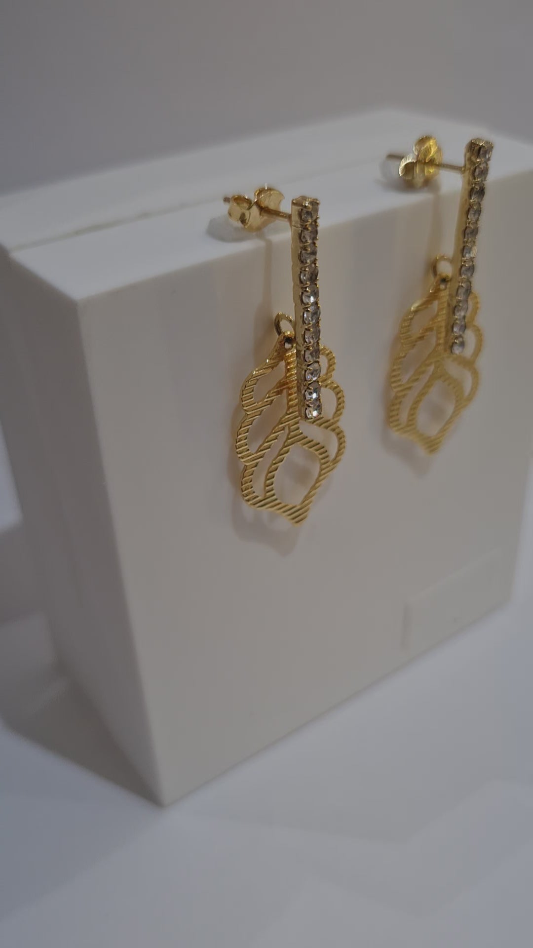 Este brinco possui um design sofisticado com barra cravejada de zircônias na parte superior e detalhe vazado em formato orgânico na parte inferior, criando um visual delicado e moderno ao mesmo tempo.