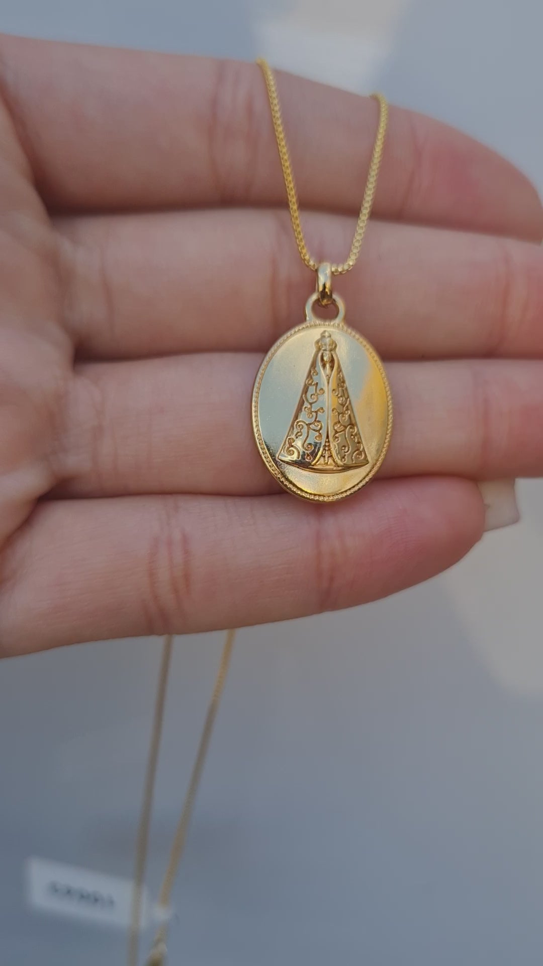 Este lindo pingente medalha traz a imagem em relevo de Nossa Senhora Aparecida, símbolo de devoção, bênçãos e amparo espiritual. Com acabamento elegante e banho em ouro 18k, é uma peça perfeita para o dia a dia ou para presentear com amor e fé.