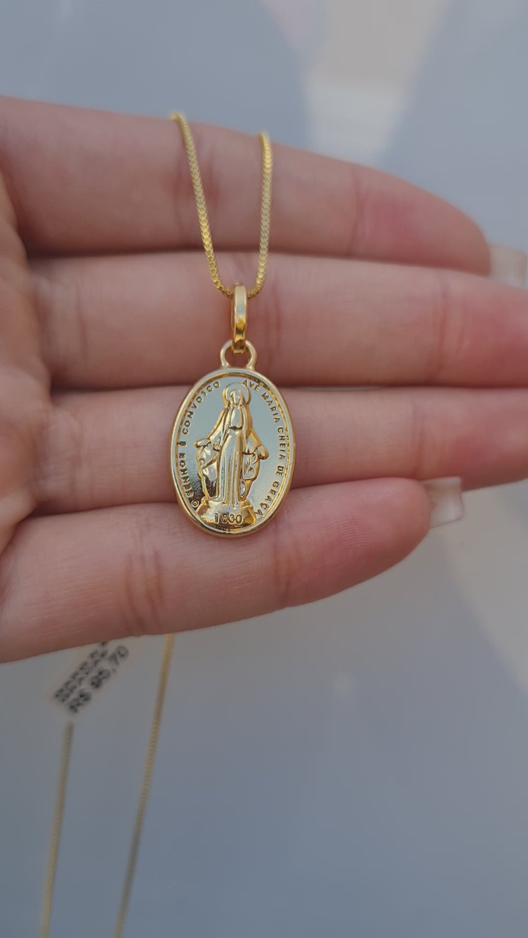 Este pingente traz a clássica Medalha Milagrosa, com a inscrição “Ave Maria cheia de graça, o Senhor é convosco” e a imagem em relevo de Nossa Senhora. Com acabamento impecável e banho em ouro 18k, é uma peça elegante e cheia de significado espiritual.