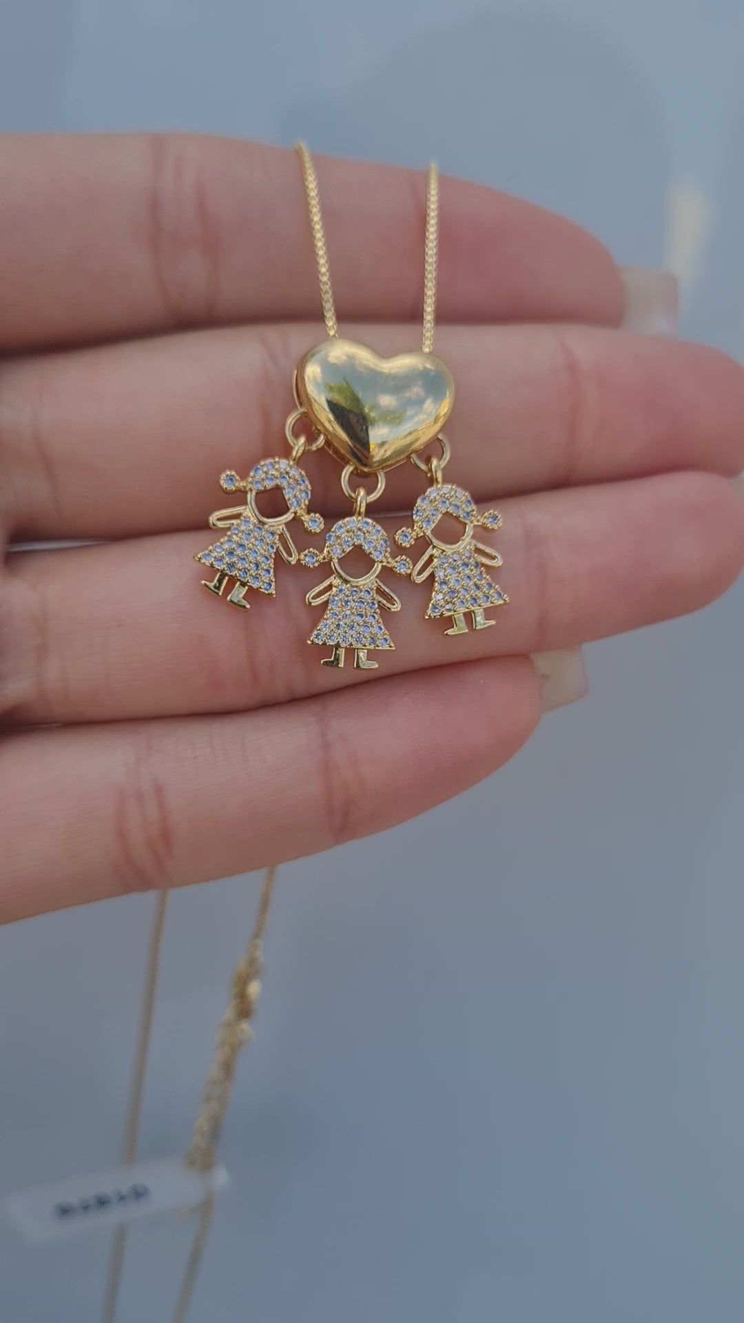 ✨ Colar Coração com Pingentes de Meninas Cravejadas Banhado a Ouro 18k ✨
